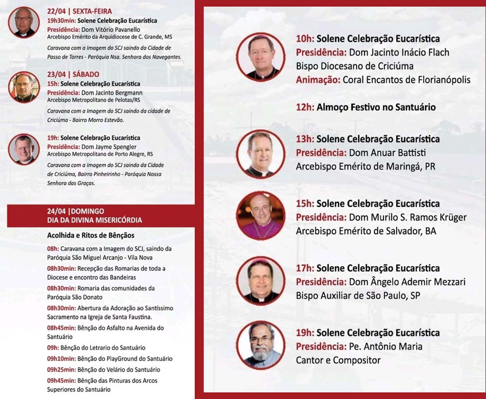Fiéis da Diocese de Criciúma participam desde o último domingo, dia 17, da Festa da Misericórdia, que neste ano celebra o quinto aniversário do Santuário Sagrado Coração Misericordioso de Jesus, na comunidade de Morro Bonito, em Içara. As celebrações continuam nesta sexta-feira, 22, e também no sábado, 23, mas o ponto alto das festividades está programado para domingo, dia 24.