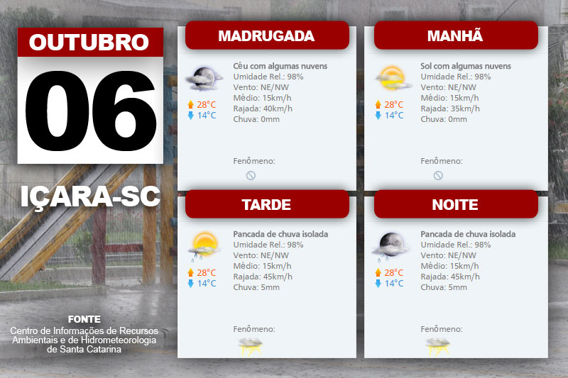 O Sol aparece junto com o aumento de nuvens nesta terça-feira. A partir da tarde a previsão é de pancadas de chuva e raios no Oeste, Meio Oeste, Planalto Sul e Litoral Sul. “Temperatura sofre elevação. Vento de nordeste a noroeste, fraco a moderado, com rajadas”, completa a meteorologista do Centro de Informações de Recursos Ambientais e de Hidrometeorologia de Santa Catarina, Gilsânia Cruz.