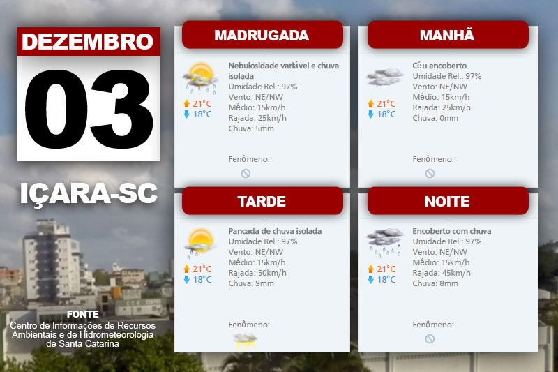 A quinta-feira é de céu nublado a encoberto pela manhã e a partir da tarde pancadas de chuva com trovoadas em todas as regiões do estado. O Centro de Informações de Recursos Ambientais e de Hidrometeorologia de Santa Catarina indica também temperatura elevada com sensação de ar abafado.