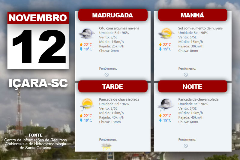 O Sol volta a aparecer na maioria das regiões nesta quinta-feira. Mas no período da tarde e noite, as pancadas isoladas de chuva ainda acontecerão, especialmente, nas regiões do Oeste ao Planalto. O Centro de Informações de Recursos Ambientais e de Hidrometeorologia de Santa Catarina ainda vento fraco a moderado, de sul a sudeste no Litoral, e de sudeste a nordeste nas demais regiões.