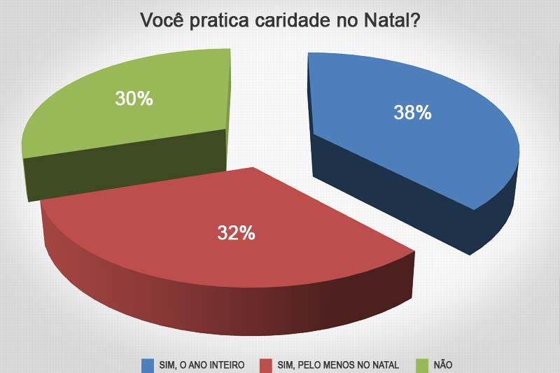 O Natal inspira a caridade para 32% dos internautas do Canal Içara. O número é baseado na enquete feita pelo portal entre os dias 7 de 14 de dezembro. Dentre os 34 leitores que responderam espontaneamente, 38% colocaram que a solidariedade é uma realidade ao longo de todo o ano. Para 29%, contudo, nem mesmo a festividade desperta a filantropia.