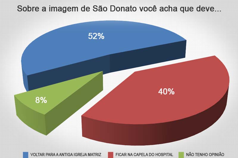 Qual o encaminhamento deve ter a imagem de São Donato? Ao todo, o Canal Içara deu três opções numa enquete entre 22 de dezembro e 5 de janeiro. Entre 25 internautas que responderam, 52% apontaram que deve retornar para a antiga igreja matriz. Outros 40% manifestaram pela manutenção na capela do Hospital São Donato. Somente 8% indicaram não ter opinião formada sobre o assunto.