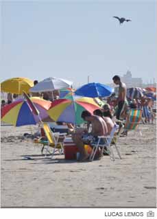 Praia cheia em sábado ensolarado