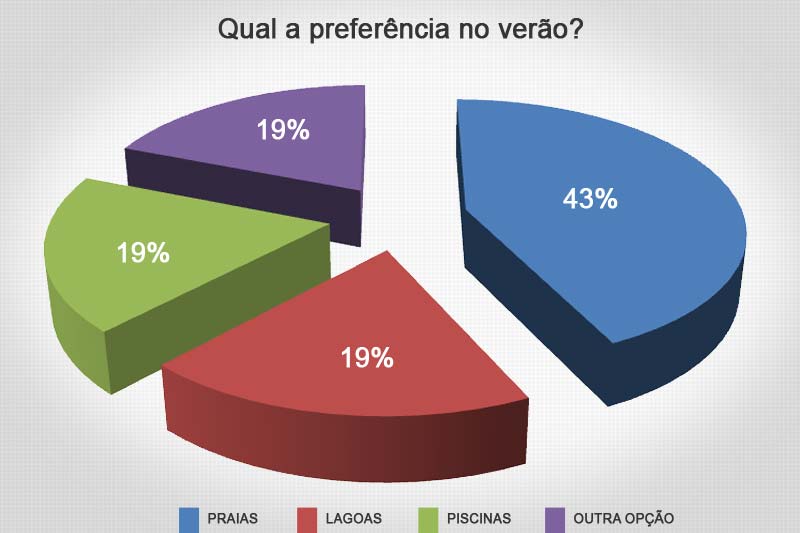 Qual a preferência no verão? O questionamento foi respondido do dia 24 a 30 de novembro por 21 internautas do Canal Içara. Dentre eles, 43% apontaram pelas praias. Outros 19% irão para lagoas. A mesma porcentagem representa ainda o uso de piscinas e se repetiu também na alternativa “outra opção”.