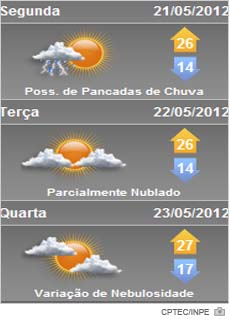 Nesta segunda-feira prevalecem as nuvens devido à circulação marítima com chuva fraca no início do dia no Litoral e no Vale do Itajaí. Durante a noite ainda pode ocorrer chuva na Grande Florianópolis e Litoral Norte. No restante do estado uma massa de ar seco deixa o clima estável com predomínio de Sol em Santa Catarina. Temperatura em elevação. Variará de 5 a 26ºC.