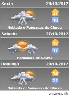 No sábado e domingo prevalece a nebulosidade variável com aberturas de Sol e pancadas isoladas de chuva com trovoadas, especialmente na madrugada e entre a tarde e noite devido a influência de uma cavado (área alongada de baixa pressão) e do forte aquecimento. Temperatura elevada com sensação de ar abafado.