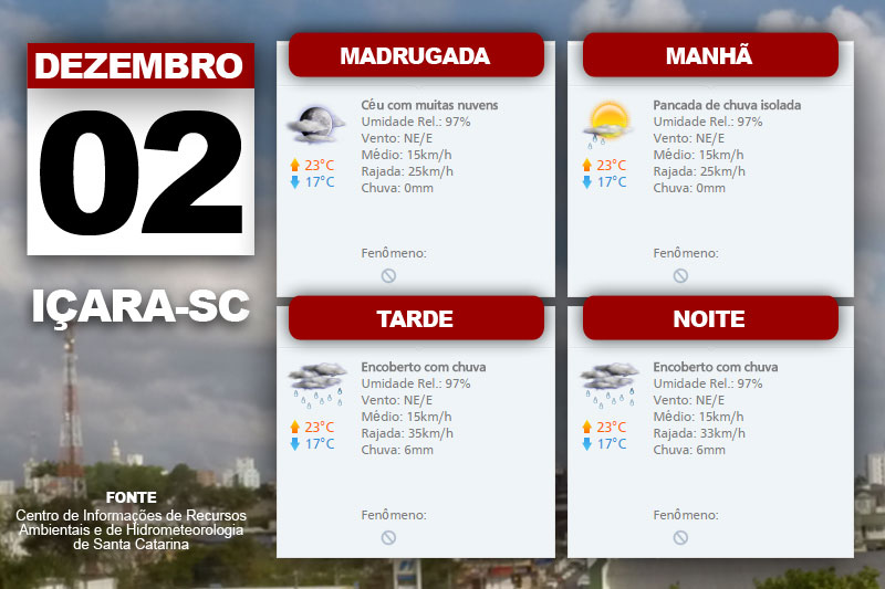 A quarta-feira inicia com tempo instável com muitas nuvens, algumas aberturas de Sol, pancadas de chuva a qualquer hora do dia e descarga elétrica especialmente no Oeste. O Centro de Informações de Recursos Ambientais e de Hidrometeorologia de Santa Catarina indica também temperatura elevada com sensação de ar abafado.