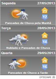 Quarta-feira de tempo instável com nebulosidade variável e chuva isolada qualquer hora do dia devido a passagem de uma frente fria pelo oceano na altura do Litoral de Santa Catarina. Temperatura em declínio entre a tarde e noite com o avanço de uma massa de ar frio e seco, de fraca intensidade. Quinta-feira de tempo estável com sol, ar seco e temperatura baixa, com formação de geada na madrugada e início da manhã nas áreas altas. Na sexta-feira nada muda. As temperaturas variam dos 5ºC aos 25ºC.