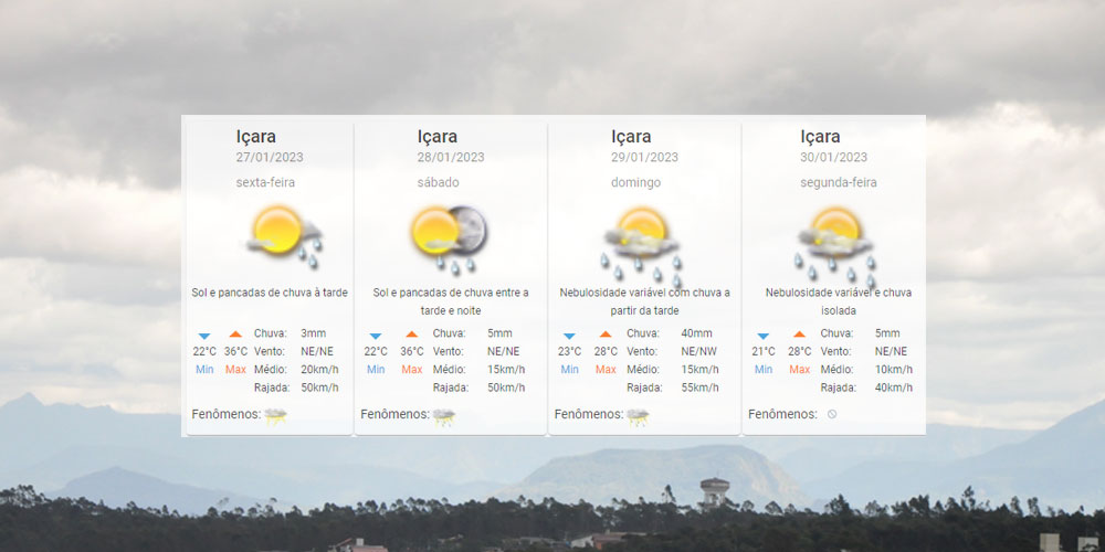 Vento: nordeste, fraco a moderado, com rajadas à tarde associadas às trovoadas.