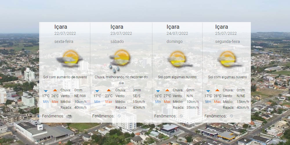 Os próximos dias serão quentes para a época do ano e com possibilidade de chuva restrita somente ao sábado. Para Içara, o Centro de Informações de Recursos Ambientais e de Hidrometeorologia de Santa Catarina aponta uma amplitude térmica de até 11°C. A temperatura amena pela manhã - de pelo menos 16°C - vai aumentar a tarde e pode chegar próxima aos 30°C. Confira a previsão completa: