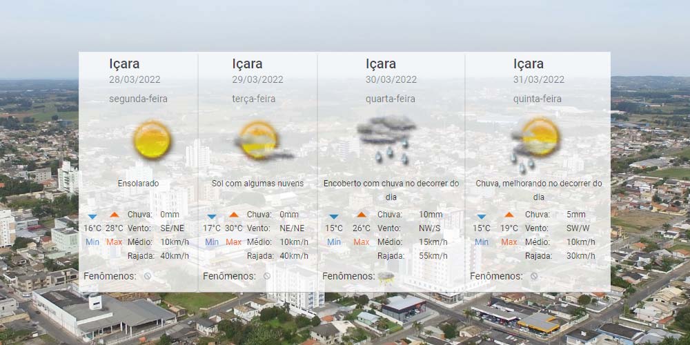 A semana inicia ensolarada e com temperatura em elevação, mas não deve terminar assim. A partir já de quarta-feira, o calor começa a diminuir com pancadas de chuva e risco também de temporais. Para Içara, o Centro de Informações de Recursos Ambientais e de Hidrometeorologia de Santa Catarina aponta de 15°C a 30°C nestes próximos dias e até 10mm de precipitação. Confira a previsão completa abaixo.