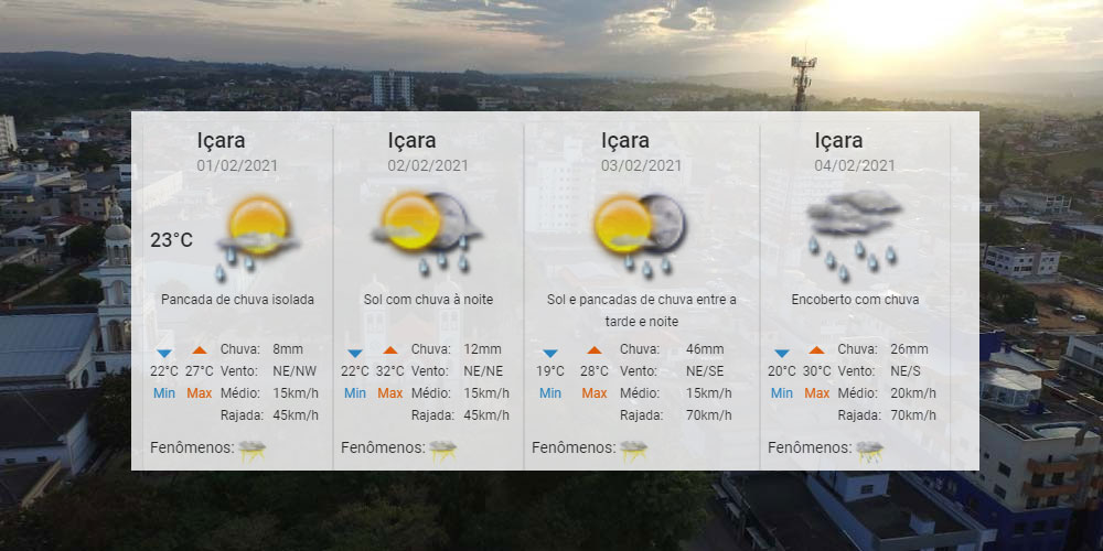 A temperatura elevada continua pelo menos até terça-feira em Santa Catarina. Segue também as condições para temporais entre a tarde e noite. Já mais próximo do fim de semana, a previsão indica redução do calor e chuva mais forte. Para Içara, o Centro de Informações de Recursos Ambientais e de Hidrometeorologia de Santa Catarina indica mínimas de 19°C e máximas próximas de 32°C ao longo dessa semana. Confira o detalhamento: