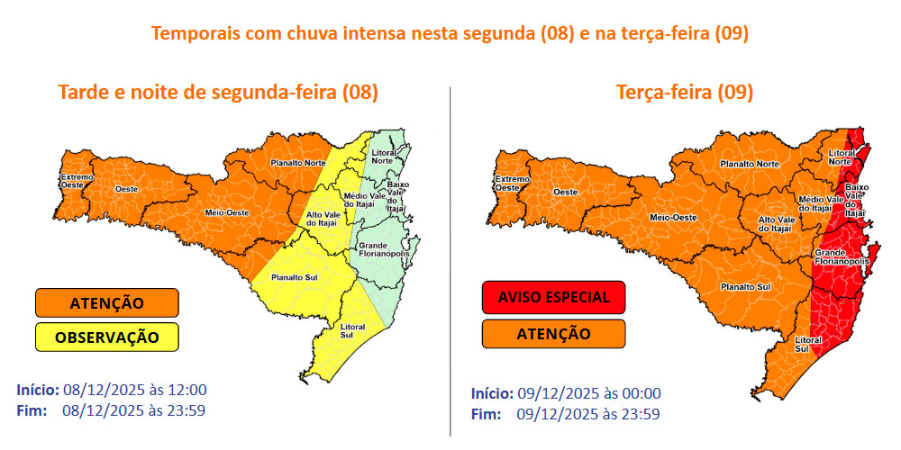 Na terça-feira, as instabilidades se intensificam e a temperatura diminui, com máxima de 21°C e mínima de 18°C. A chuva pode atingir 31,4 mm, ultrapassando o limite considerado moderado para Içara, e o risco para alagamentos e enxurradas é muito alto. A previsão indica 100% de probabilidade de precipitação ao longo do dia sob a influência de um ciclone extratropical na costa. Na quarta-feira, com o afastamento do ciclone, as instabilidades perdem força e os temporais acontecem de maneira mais isolada com rajadas entre 60 e 80km/h.