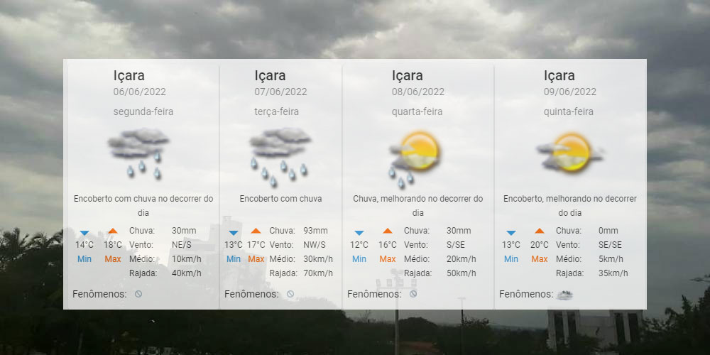 Vento: variável de noroeste a sul, fraco a moderado, com rajadas mais intensas (50 a 70km/h).