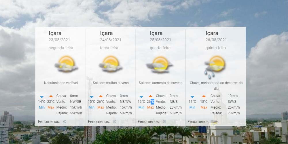 A temperatura deve ser mais amena nos próximos dias com a máxima de até 26°C. Para Içara, o Centro de Informações de Recursos Ambientais e de Hidrometeorologia de Santa Catarina indica também o aumento de nebulosidade e a possibilidade de chuva a partir já de quarta-feira. Confira a previsão completa.