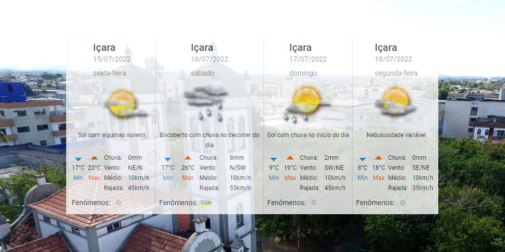 A nebulosidade vai aumentar neste fim de semana, assim como a possibilidade de chuva entre sábado e a manhã de domingo. Já as temperaturas mínimas vão cair. Para Içara, o Centro de Informações de Recursos Ambientais e de Hidrometeorologia de Santa Catarina indica de 8°C a 26°C nos próximos dias. Confira a previsão completa.