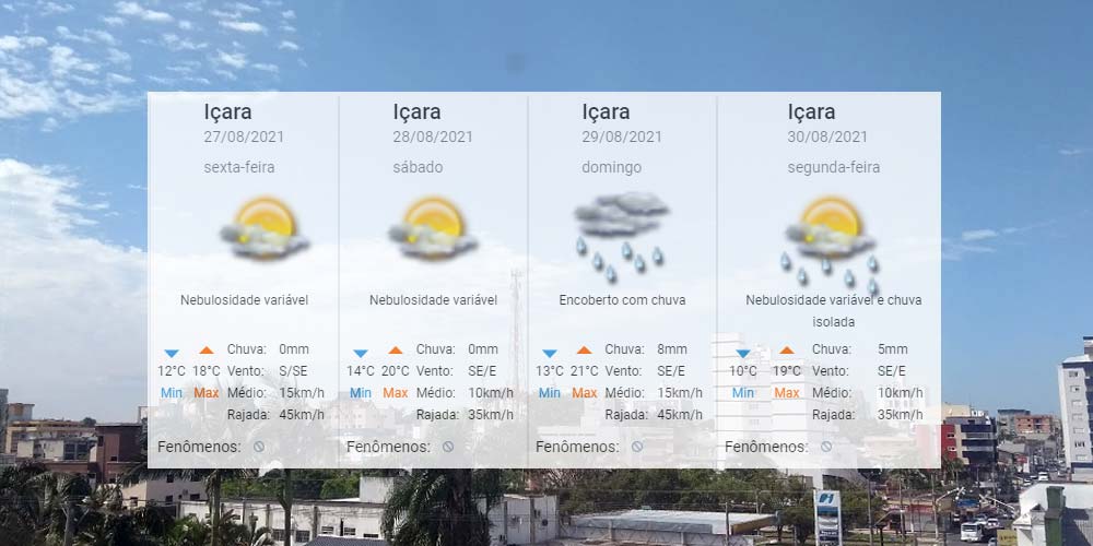 O fim de semana será de temperaturas moderadas e terá o aumento das condições de chuva em Santa Catarina devido a circulação marítima. Para Içara, o Centro de Informações de Recursos Ambientais e de Hidrometeorologia de Santa Catarina aponta de 12°C a 21°C nestes dias. Confira a previsão completa.