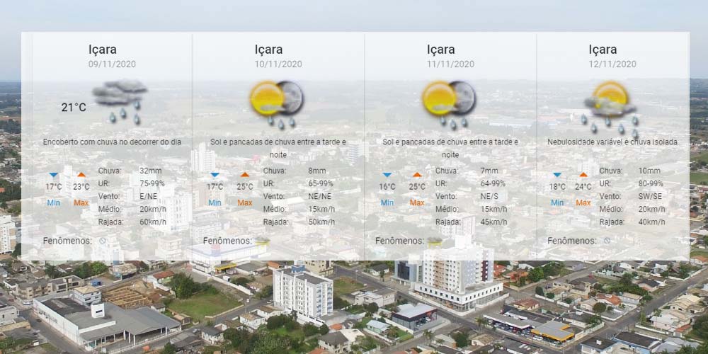 A temperatura amena segue nos próximos dias junto com as condições de chuva e até de temporais isolados. Para Içara, o Centro de Informações de Recursos Ambientais e de Hidrometeorologia de Santa Catarina aponta de 16°C a 25°C no período.