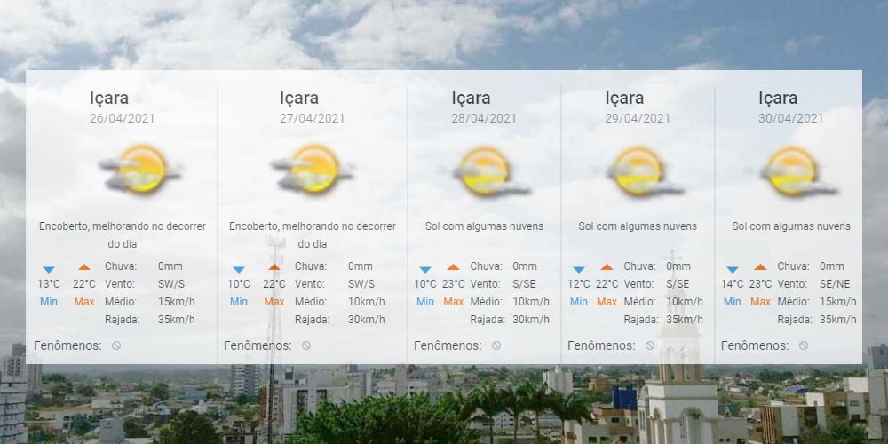 Os próximos dias serão de diminuição de nuvens. Mas a presença do sol não significará elevação nas temperaturas. Para Içara, o Centro de Informações de Recursos Ambientais e de Hidrometeorologia de Santa Catarina indica de 10°C a 23°C no período. Confira a previsão completa.