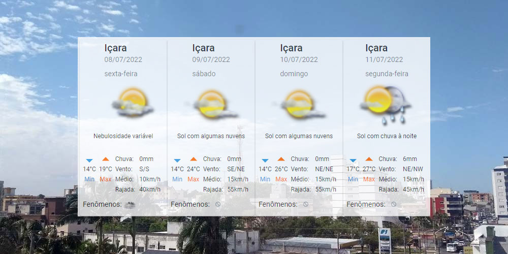 O tempo firme continua em Santa Catarina nos próximos dias com a perspectiva de temperaturas confortáveis, ou seja, não tão frias, nem muito quentes. Para Içara, o Centro de Informações de Recursos Ambientais e de Hidrometeorologia de Santa Catarina aponta de 14°C a 27°C e a possibilidade de chuva somente a partir da noite de segunda-feira. Confira a previsão completa do Ciram abaixo.