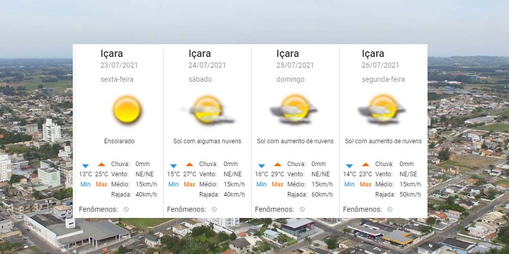 O fim de semana será estável e ensolarado em Santa Catarina. A previsão é que somente no domingo a nebulosidade volta a aumentar no decorrer do dia. Para Içara, o Centro de Informações de Recursos Ambientais e de Hidrometeorologia de Santa Catarina aponta 13°C como temperatura mínima. Já a temperatura máxima deve ser de 29°C no período. Confira a previsão completa.