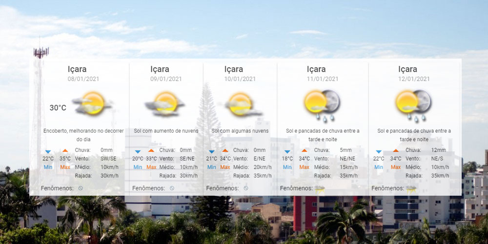 Os próximos dias serão quentes e com baixa possibilidade de chuva. Para Içara, o Centro de Informações de Recursos Ambientais e de Hidrometeorologia de Santa Catarina aponta mínimas de 18°C a 22°C e máximas de 33°C a 34°C ao longo da semana.