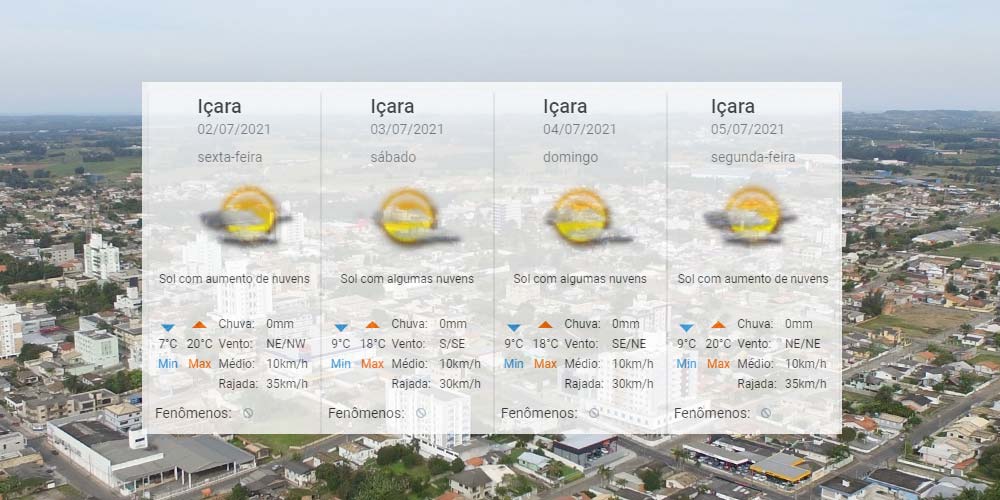 As manhãs e noites geladas vão continuar, mas os dias tendem a ser menos frios. Para Içara, o Centro de Informações de Recursos Ambientais e de Hidrometeorologia de Santa Catarina aponta até 7°C como temperatura mínima desta sexta-feira, dia 2. Já a temperatura máxima deve ser de 20°C no período. Confira a previsão completa.