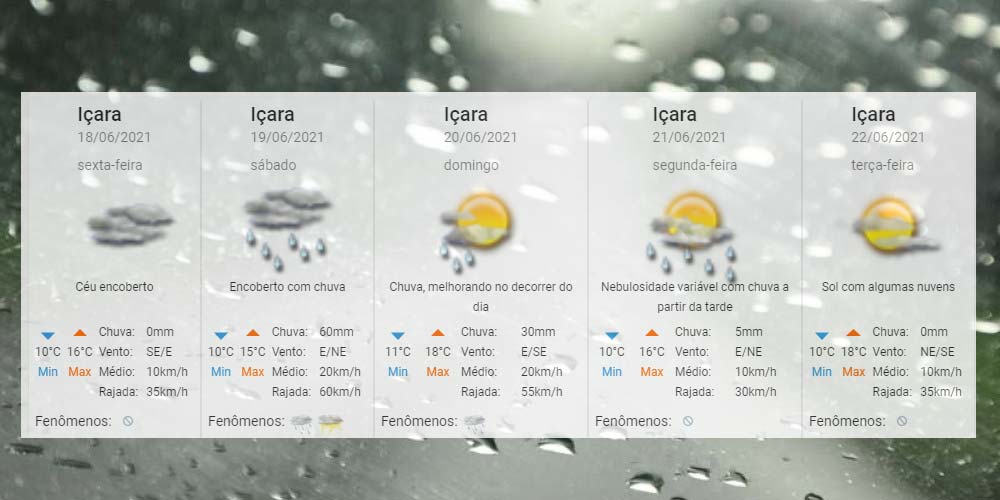 Os próximos dias serão de céu encoberto e chuva, com acumulo de até 90mm entre sábado e domingo em Içara. O Centro de Informações de Recursos Ambientais e de Hidrometeorologia de Santa Catarina ainda aponta, para a cidade, de 10°C a 18°C nos próximos dias. Confira a previsão completa: