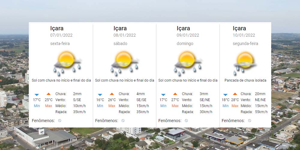 A nebulosidade no início e no fim do dia vai impactar em pancadas de chuva nos próximos dias. É um repeteco desse início de ano, inclusive, com a temperatura elevada. Para Içara, o Centro de Informações de Recursos Ambientais e de Hidrometeorologia de Santa Catarina indica de 16°C a 28°C no período até segunda-feira. Confira a previsão completa.