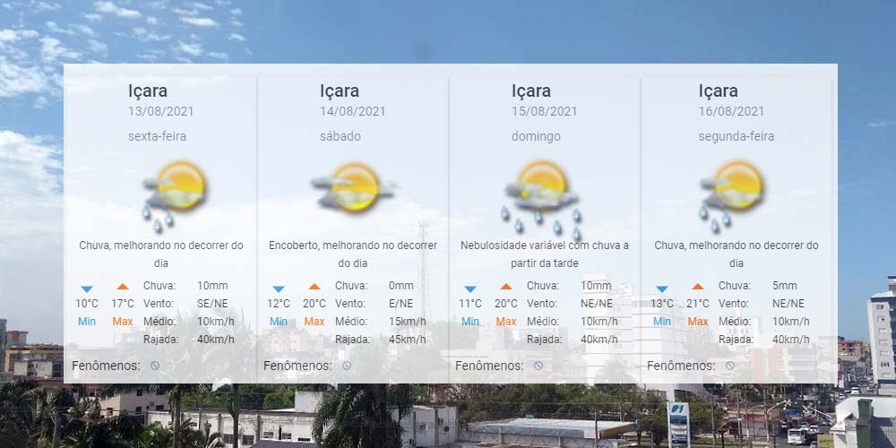 A temperatura deve subir um pouco, mas isso não significa calor. A nebulosidade também vai aumentar com momentos de chuva no fim de semana. Para Içara, o Centro de Informações de Recursos Ambientais e de Hidrometeorologia de Santa Catarina aponta de 10°C a 21°C nos próximos dias. Confira a previsão completa.