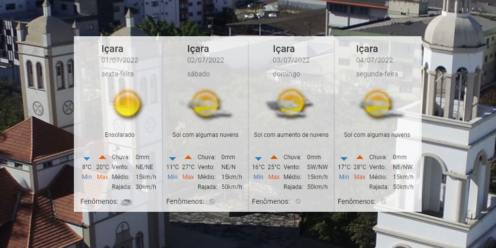 O fim de semana será propício para atividades ao ar livre! Terá sol e a presença de nuvens deve aumentar somente no domingo, dia 3. Para Içara, o Centro de Informações de Recursos Ambientais e de Hidrometeorologia de Santa Catarina indica ainda temperaturas amenas. Será de 8°C a 28°C. Confira a previsão completa.