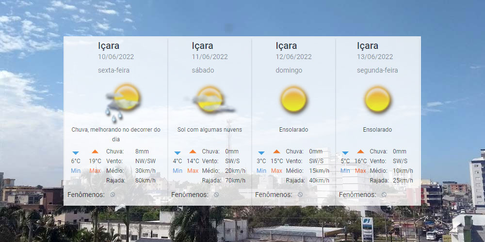 Vento: noroeste a sudoeste, fraco a moderado com rajadas mais intensas de 50 a 80km/h no Planalto Sul e Litoral.