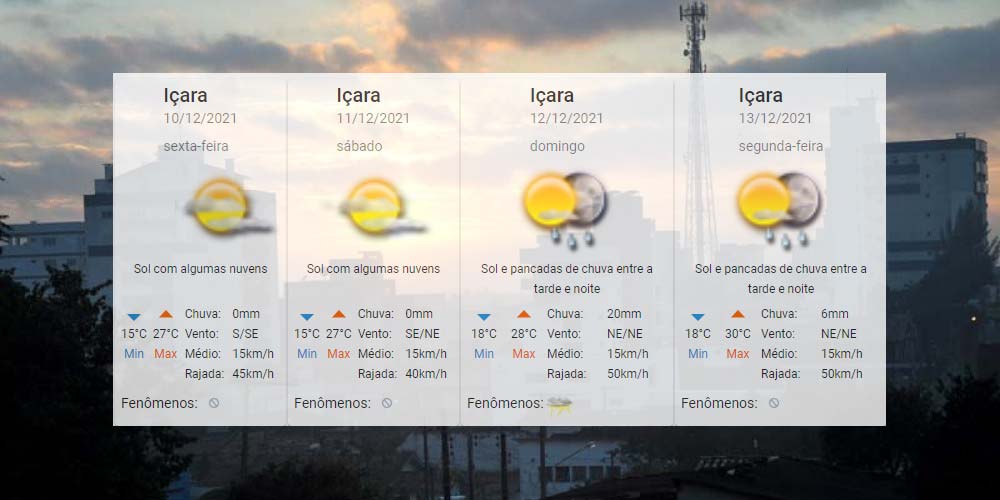 A nebulosidade deve aumentar com o calor previsto para o fim de semana, mas a possibilidade de chuva fica somente para domingo. Para Içara, o Centro de Informações de Recursos Ambientais e de Hidrometeorologia de Santa Catarina aponta a elevação gradativa dos termômetros até 30°C na próxima segunda-feira, dia 13. Confira a previsão completa.