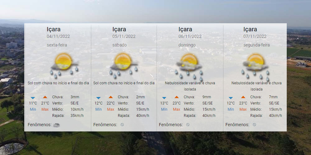 As temperaturas mínimas vão subir, mas ainda continuarão amenas no fim de semana. Para Içara, o Centro de Informações de Recursos Ambientais e de Hidrometeorologia de SC aponta de 11°C a 23°C nestes dias. O Sol vai aparecer nesta sexta-feira e sábado, entretanto, com possibilidade de chuva no início e no fim do dia. Confira a previsão completa: