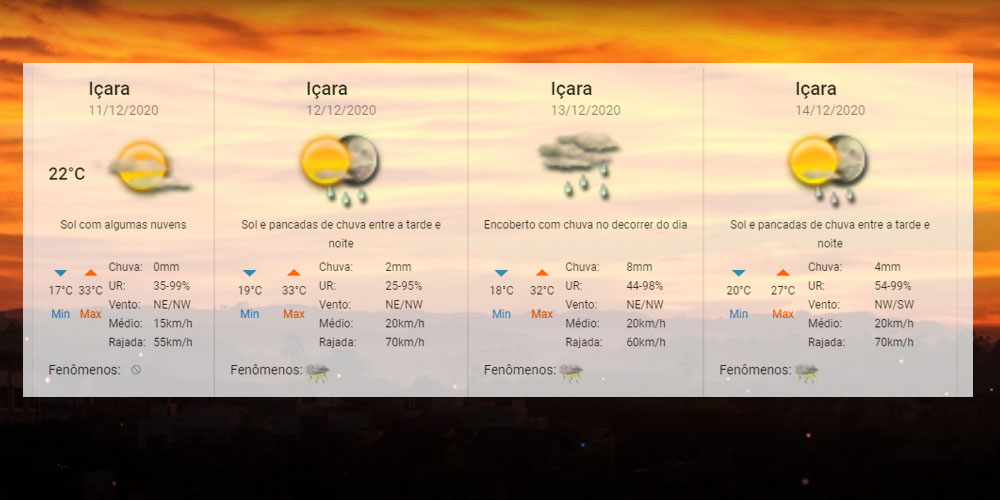 O fim de semana será típico de um dia de verão. Terá calor, aumento de nuvens, condições de pancadas de chuva e também temporais localizados. Para Içara, o Centro de Informações de Recursos Ambientais e de Hidrometeorologia de Santa Catarina indica mínimas de 17°C a 20°C e máximas de 27°C a 33°C ao longo do período.