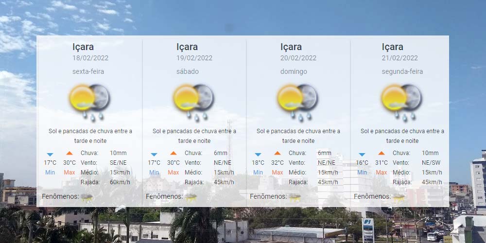 Pancadas de chuva de verão com temporal isolado e passageiro estão previstos nos fins de tarde dos próximos dias. Para Içara, o Centro de Informações de Recursos Ambientais e de Hidrometeorologia de Santa Catarina aponta ainda temperatura de 16°C a 32°C. Confira a previsão completa: