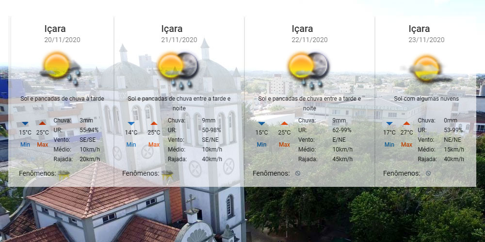 As condições de pancadas de chuva, com trovoadas, permanecem principalmente nesta sexta-feira e sábado. Mas ainda podem chegar até domingo. Para Içara, o Centro de Informações de Recursos Ambientais e de Hidrometeorologia de Santa Catarina indica mínimas de 14°C e máximas de 27°C no período.