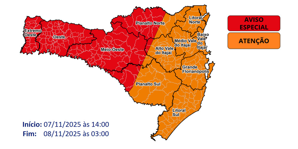 As instabilidades começam a se formar ainda pela manhã de sexta, nas áreas de divisa com o Rio Grande do Sul, e ganham força à tarde, especialmente no Grande Oeste e nos Planaltos, onde há maior risco de tempestades severas. No final do dia, os temporais avançam para a Grande Florianópolis, Vale do Itajaí e Litoral Norte. Durante os eventos, as rajadas de vento podem superar os 90 km/h, e a chuva deve ocorrer de forma intensa em curtos períodos de tempo.
