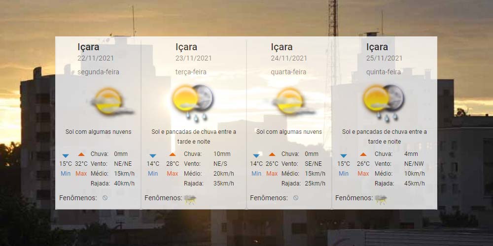 As temperaturas continuarão próximas aos 30°C nesta semana, mas o tempo terá mudança com o aumento da nebulosidade e a proximidade de uma frente fria com a possibilidade, inclusive, de temporais. Para Içara, o Centro de Informações de Recursos Ambientais e de Hidrometeorologia de Santa Catarina aponta de 14ºC a 32ºC e até 10mm de chuva. Confira a previsão completa.