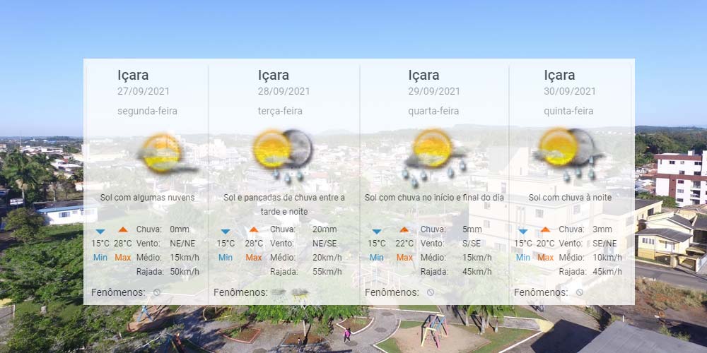 A temperatura tende a baixar nesta semana devido a mudança no tempo. A partir de terça-feira a possibilidade de chuva vai aumentar junto com o risco de temporais localizados. Para Içara, o Centro de Informações de Recursos Ambientais e de Hidrometeorologia de Santa Catarina aponta de 15°C a 28°C nestes dias. Confira a previsão completa.