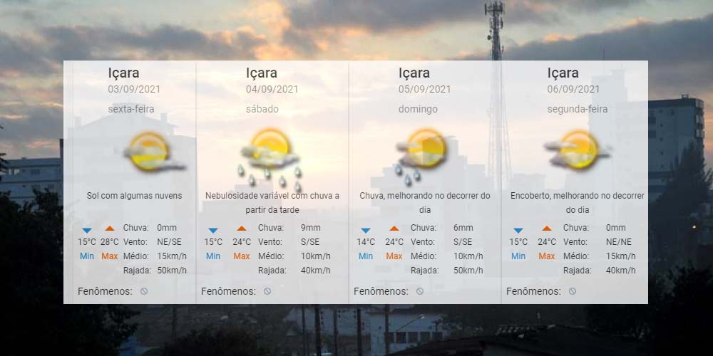 O calor segue nesta sexta-feira, dia 3. Mas o fim de semana não terá seguimento do tempo firme. Uma frente fria se aproxima e isso significa condição de chuva, especialmente à tarde. A previsão é que a nebulosidade melhore a partir de domingo. Para Içara, o Centro de Informações de Recursos Ambientais e de Hidrometeorologia de Santa Catarina aponta mínimas de 14°C a 15°C e máximas de 24°C a 28°C no período.