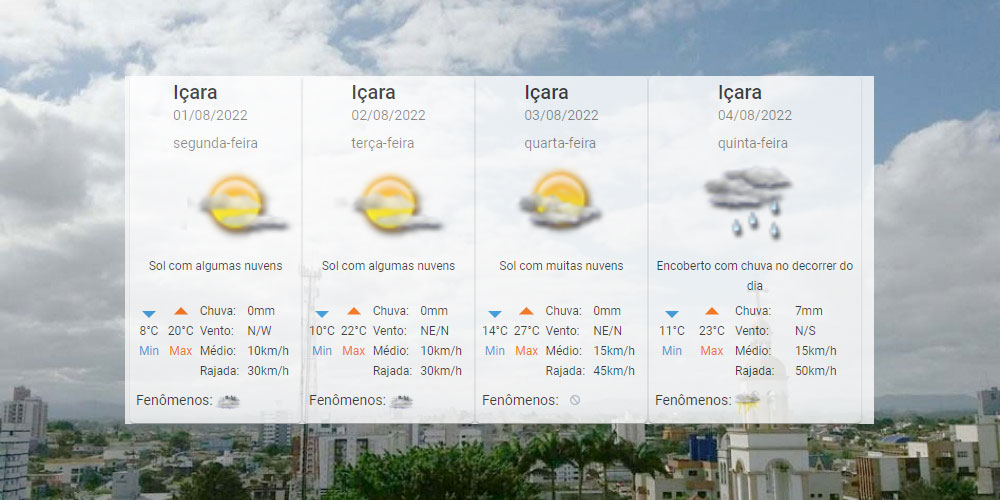 O sol permanece com algumas nuvens até quarta-feira, dia 3. Já na quinta, a proximidade de uma frente fria representa condições de chuva. Quanto a temperatura, para Içara, o Centro de Informações de Recursos Ambientais e de Hidrometeorologia de Santa Catarina indica de 8°C a 23°C no período. Confira a previsão completa para a cidade: