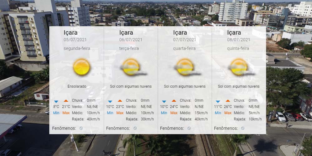 Mesmo menos intensa, a sensação de frio permanece por alguns momentos nos próximos dias, assim como a massa de ar seco. Para Içara, o Centro de Informações de Recursos Ambientais e de Hidrometeorologia de Santa Catarina aponta até 8°C como temperatura mínima nesta segunda-feira, dia 5. Já a temperatura máxima deve ser de 26°C no período. Confira a previsão completa.