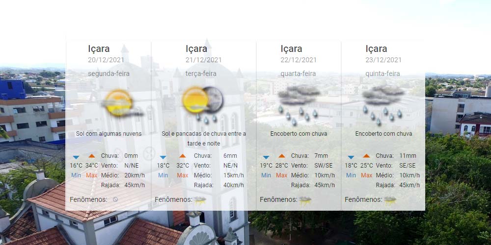 As temperaturas máximas entram em declínio nesta semana na proporção inversa ao aumento da nebulosidade e das condições de chuva. Para Içara, o Centro de Informações de Recursos Ambientais e de Hidrometeorologia de Santa Catarina indica de 16°C a 34°C ao longo da semana, sendo o dia mais quente nesta segunda-feira. Confira a previsão completa: