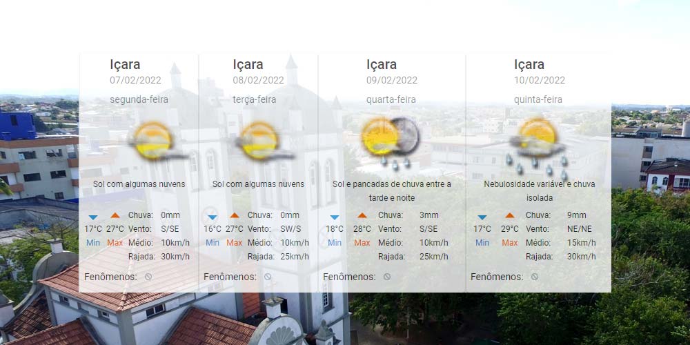 Essa semana será de aumento gradativo da nebulosidade. E a cobertura vai resultar em possibilidade de chuva entre a tarde e noite já na quarta-feira. A temperatura também tende a crescer. Para Içara, o Centro de Informações de Recursos Ambientais e de Hidrometeorologia de Santa Catarina indica mínimas de 16°C e máximas de 29°C no período. Confira a previsão completa.
