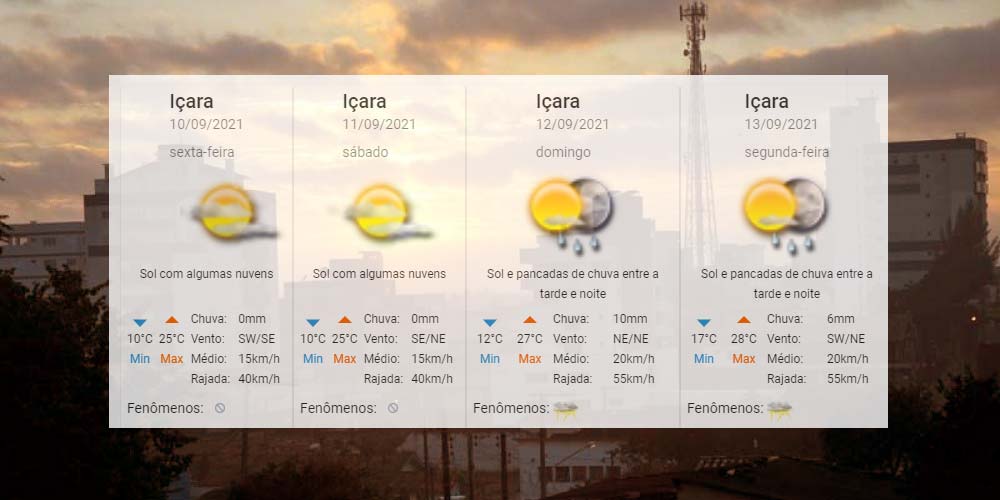 A nebulosidade volta a crescer no fim de semana e já no domingo poderá ter chuva no Litoral Sul. Para Içara, o Centro de Informações de Recursos Ambientais e de Hidrometeorologia de Santa Catarina aponta mínimas de 10°C a 17°C e máximas de 25°C a 28°C. Confira a previsão completa.