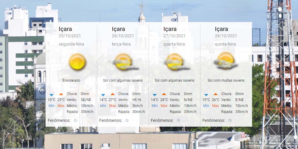 A segunda-feira ensolarada deve ceder espaço para o aumento da nebulosidade nos próximos dias e também vai resultar em chuva, mas não para o Litoral Sul. Os chuviscos ficarão concentrados no Vale do Itajaí, Grande Florianópolis, Litoral Norte e chegará ainda ao Meio-Oeste. Para Içara, o Centro de Informações de Recursos Ambientais e de Hidrometeorologia de Santa Catarina aponta temperaturas de 10°C a 28°C no período. Confira a previsão completa.