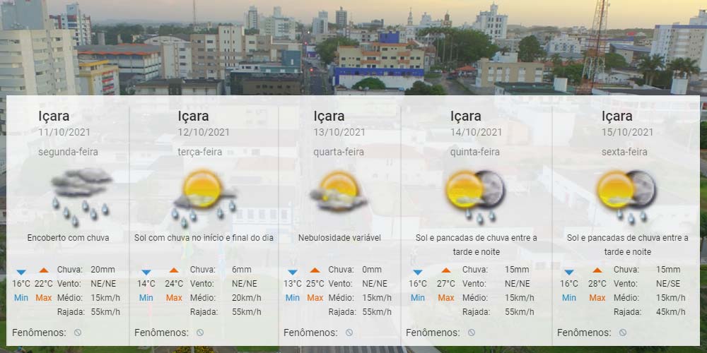 A nebulosidade permanece, em alguns momentos com chuva. A diferença dos últimos dias é que a temperatura começa a aumentar nesta semana. Para Içara, o Centro de Informações de Recursos Ambientais e de Hidrometeorologia de Santa Catarina aponta de 13°C a 28°C no período. Confira a previsão completa.