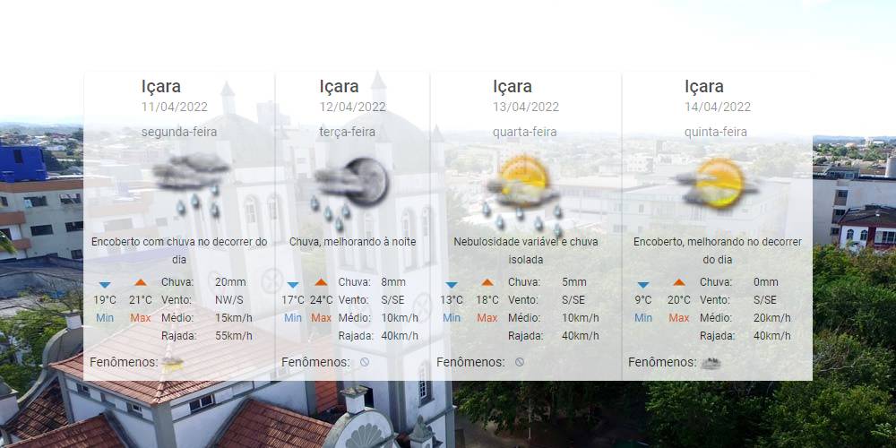 A semana será de nebulosidade, nevoeiros e ainda terá condições de chuva até quarta-feira, dia 13. Para Içara, o Centro de Informações de Recursos Ambientais e de Hidrometeorologia de Santa Catarina aponta de 9°C a 24°C nestes próximos dias e até 20mm de precipitação. Confira a previsão completa abaixo.