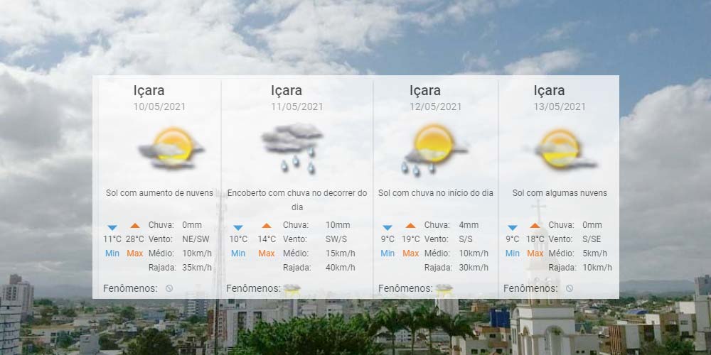 A semana terá sol, chuva, temperatura em elevação, mas também frio. Será um mix de meia estação! Para Içara, o Centro de Informações de Recursos Ambientais e de Hidrometeorologia de Santa Catarina indica de 9°C a 28°C até o fim de semana. Confira a previsão completa.
